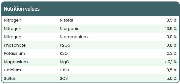 BeneSOL HAIRMEAL Pellets is a 100% pure organic fertilizer with a nitrogen content of 13,5% (!) and is made from animal hair. Nitrogen is the basis for the growth and development of vegetative organs such as roots, stems and leaves in the plant. The nitrogenous fertilizer consists of 4.5 mm pellets and is available in BigBags.